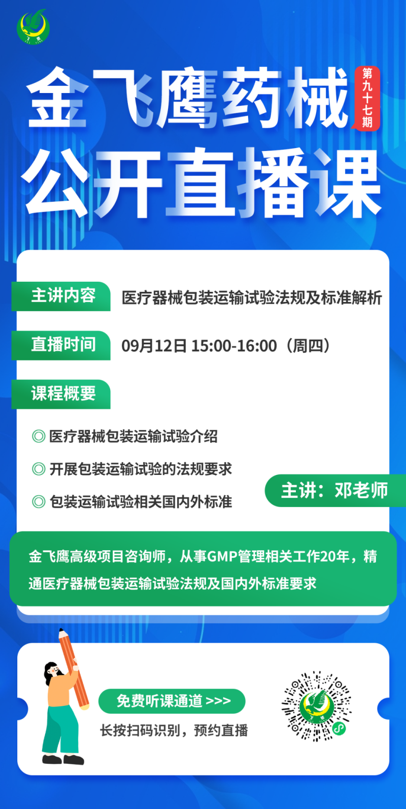 金飛鷹直播培訓(xùn),是每周一次的固定培訓(xùn)欄目,優(yōu)選金飛鷹國(guó)內(nèi)外資深注冊(cè)/項(xiàng)目老師定期為大家講解醫(yī)療器械注冊(cè)相關(guān)知識(shí),解答大家在醫(yī)療器械注冊(cè)過(guò)程中的諸多疑問(wèn)。
