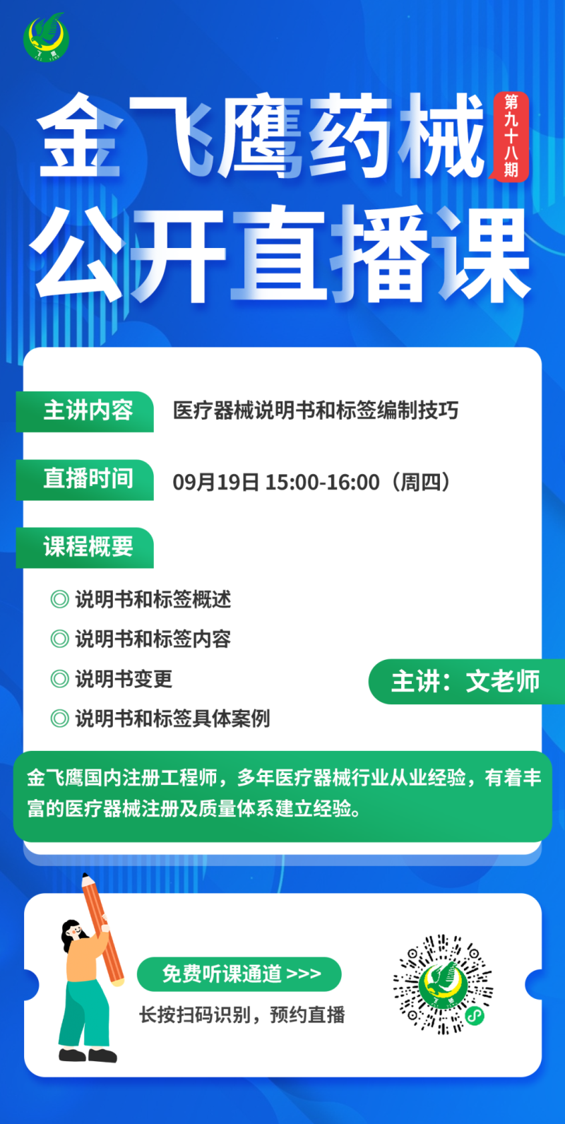 9月19日下午3點(diǎn),金飛鷹國內(nèi)注冊工程師,有著豐富的醫(yī)療器械注冊及質(zhì)量體系建立經(jīng)驗(yàn)的文老師,給大家?guī)怼夺t(yī)療器械注冊入門知識分享-產(chǎn)品說明書和標(biāo)簽編制技巧》,培訓(xùn)內(nèi)容包括說明書和標(biāo)簽概述、說明書和標(biāo)簽內(nèi)容、說明書變更、說明書和標(biāo)簽具體案例,大家千萬不要錯過了!