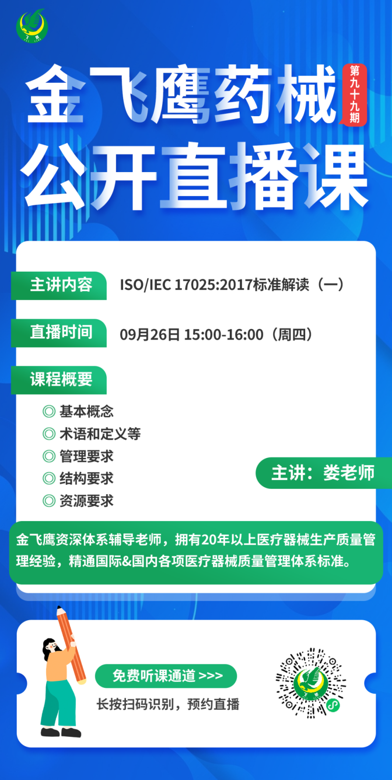 在此基礎上,國家藥監(jiān)局于2021年10月發(fā)布了《醫(yī)療器械注冊自檢管理規(guī)定》(以下簡稱《規(guī)定》),以規(guī)范注冊申請人注冊自檢工作。作為一項重要的注冊自檢參考文件,《規(guī)定》從自檢能力、自檢報告等方面對企業(yè)提出了多項要求,其中“自檢能力要求”中提到,“注冊時開展自檢的,注冊申請人應當具備自檢能力,并將自檢工作納入醫(yī)療器械質量管理體系,配備與產品檢驗要求相適應的檢驗設備設施。”但在實際應用時企業(yè)還是會有不少問題,比如到底如何判斷自身是否具備自檢能力?自檢實驗室有什么要求?根據金飛鷹的日常輔導經驗,結合《規(guī)定》要求,企業(yè)自檢實驗室應按照ISO/IEC 17025《測試和校準實驗室能力的通用要求》要求實施,因而此次我們給大家安排了ISO/IEC 17025標準解讀的課題,因內容較多,本課題將分為兩期來講,擬開展注冊自檢的醫(yī)械企業(yè)一定不要錯過了~9月26日下午3點,金飛鷹高級項目咨詢師,從事GMP管理相關工作20年,精通國際&國內各項醫(yī)療器械質量管理體系標準的婁老師,給大家?guī)怼禝SO/IEC 17025:2017標準解讀(一)》,培訓內容包括基本概念、術語和定義等、管理要求、結構要求、資源要求,想聽課的朋友記得提前預約哦!