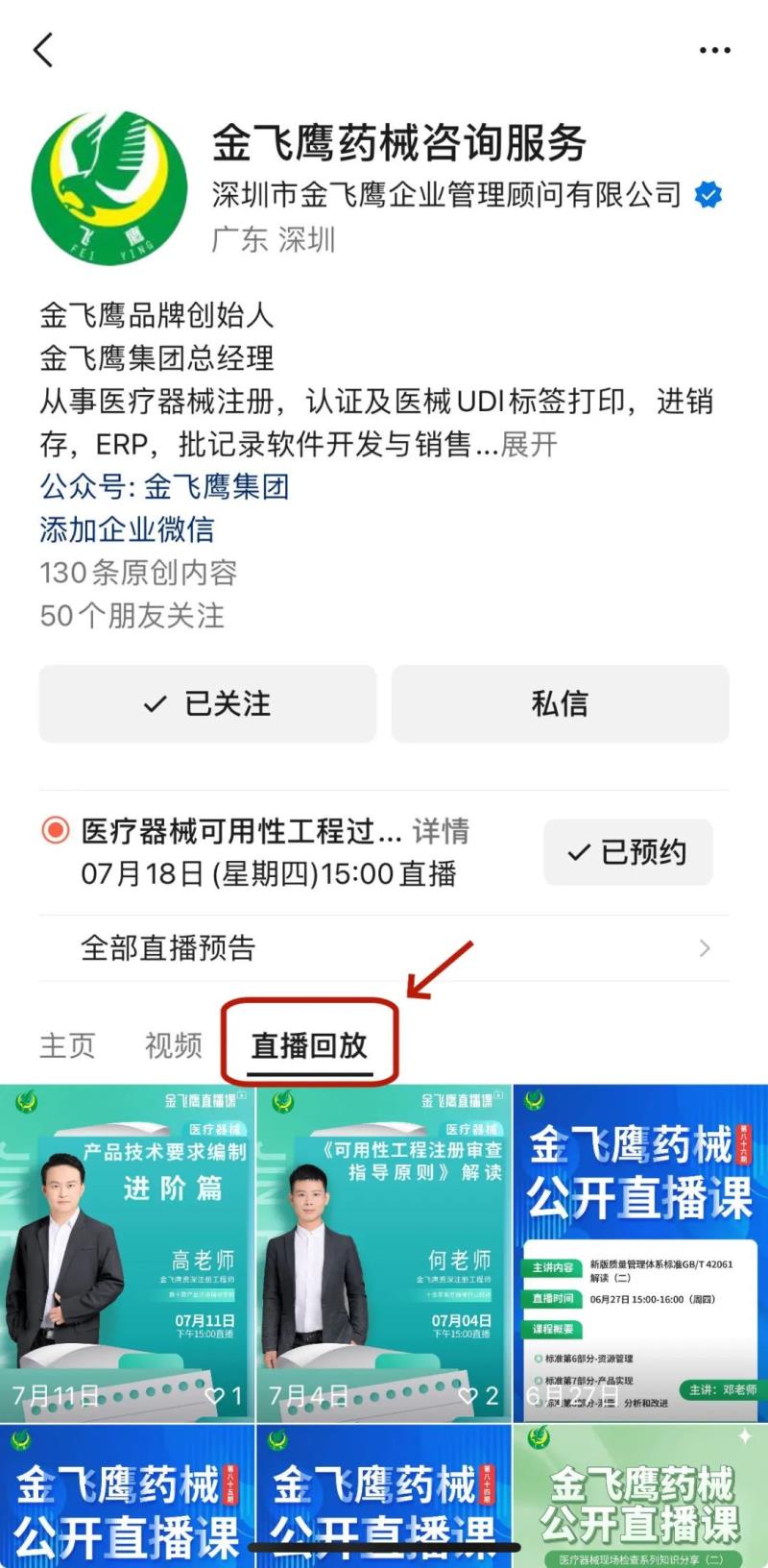往期直播培訓(xùn)課程支持回放,關(guān)注“金飛鷹藥械咨詢服務(wù)”視頻號(hào)并點(diǎn)擊視頻號(hào)主頁(yè),即可查看“直播回放”哦~