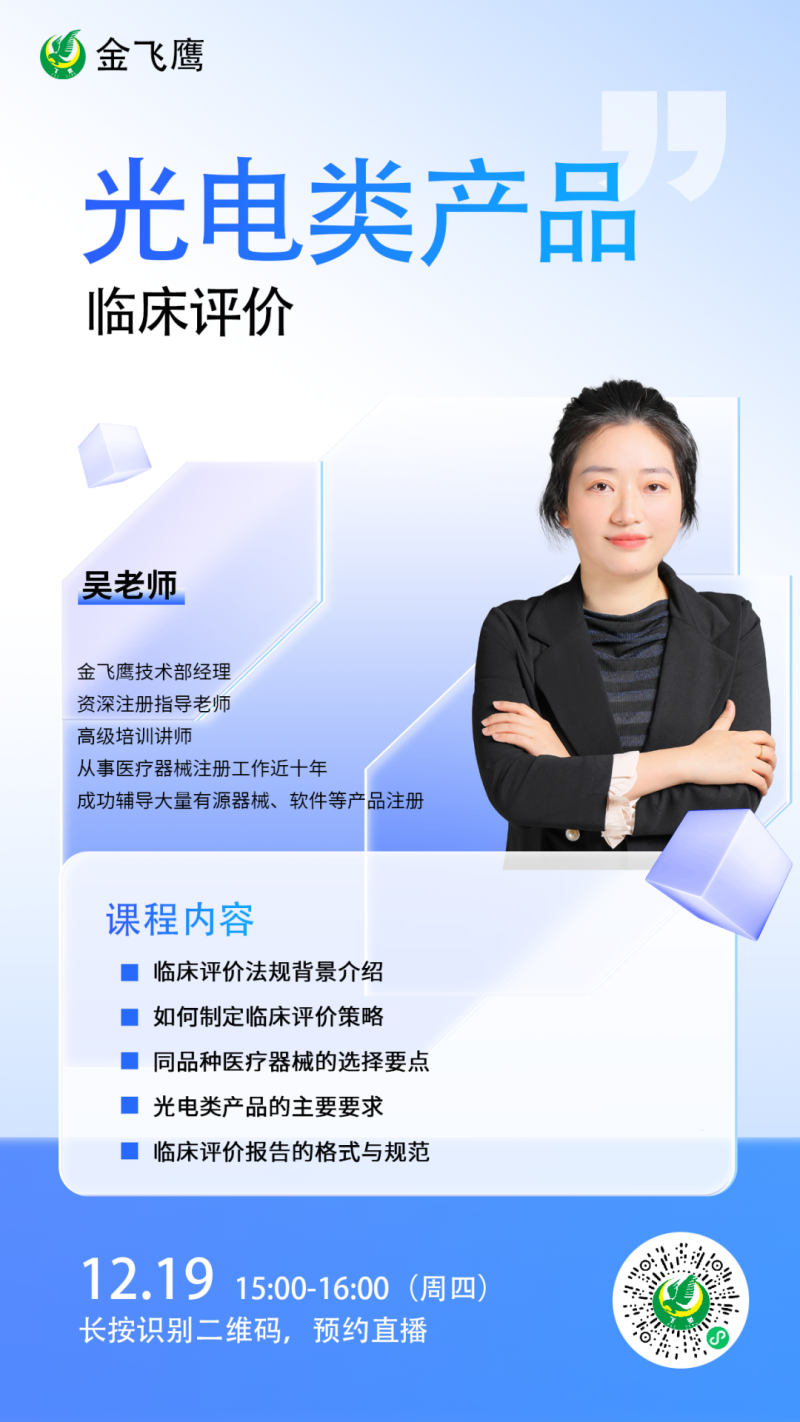 根據(jù)金飛鷹近18年的醫(yī)療器械注冊輔導(dǎo)經(jīng)驗總結(jié),臨床評價資料一直是讓企業(yè)最為頭疼的項目,資料的不完善會直接導(dǎo)致注冊周期的延長。經(jīng)常關(guān)注我們的朋友也許還記得,此前我們跟大家分享過幾期有關(guān)醫(yī)療器械臨床評價的內(nèi)容(點擊視頻號主頁可觀看回放),那么本期培訓(xùn),我們在帶大家一起回顧臨床評價基礎(chǔ)知識的同時,主要偏向于光電類產(chǎn)品的臨床評價,結(jié)合我們輔導(dǎo)過的光電類產(chǎn)品案例進(jìn)行講解,從而給此類企業(yè)臨床評價提供更多實用參考。12月19日下午3點,金飛鷹技術(shù)部經(jīng)理、從事醫(yī)療器械注冊工作近十年的吳老師給大家?guī)怼豆怆婎惍a(chǎn)品臨床評價》,培訓(xùn)內(nèi)容包括臨床評價法規(guī)背景介紹、如何制定臨床評價策略、同品種醫(yī)療器械的選擇要點、光電類產(chǎn)品的臨床評價要求、臨床評價報告的格式與規(guī)范,想聽課的朋友記得提前預(yù)約!