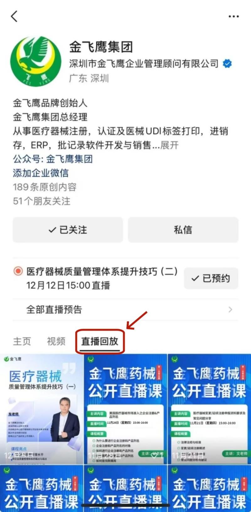 往期直播培訓(xùn)課程支持回放,關(guān)注“金飛鷹藥械咨詢服務(wù)”視頻號并點擊視頻號主頁,即可查看“直播回放”哦~