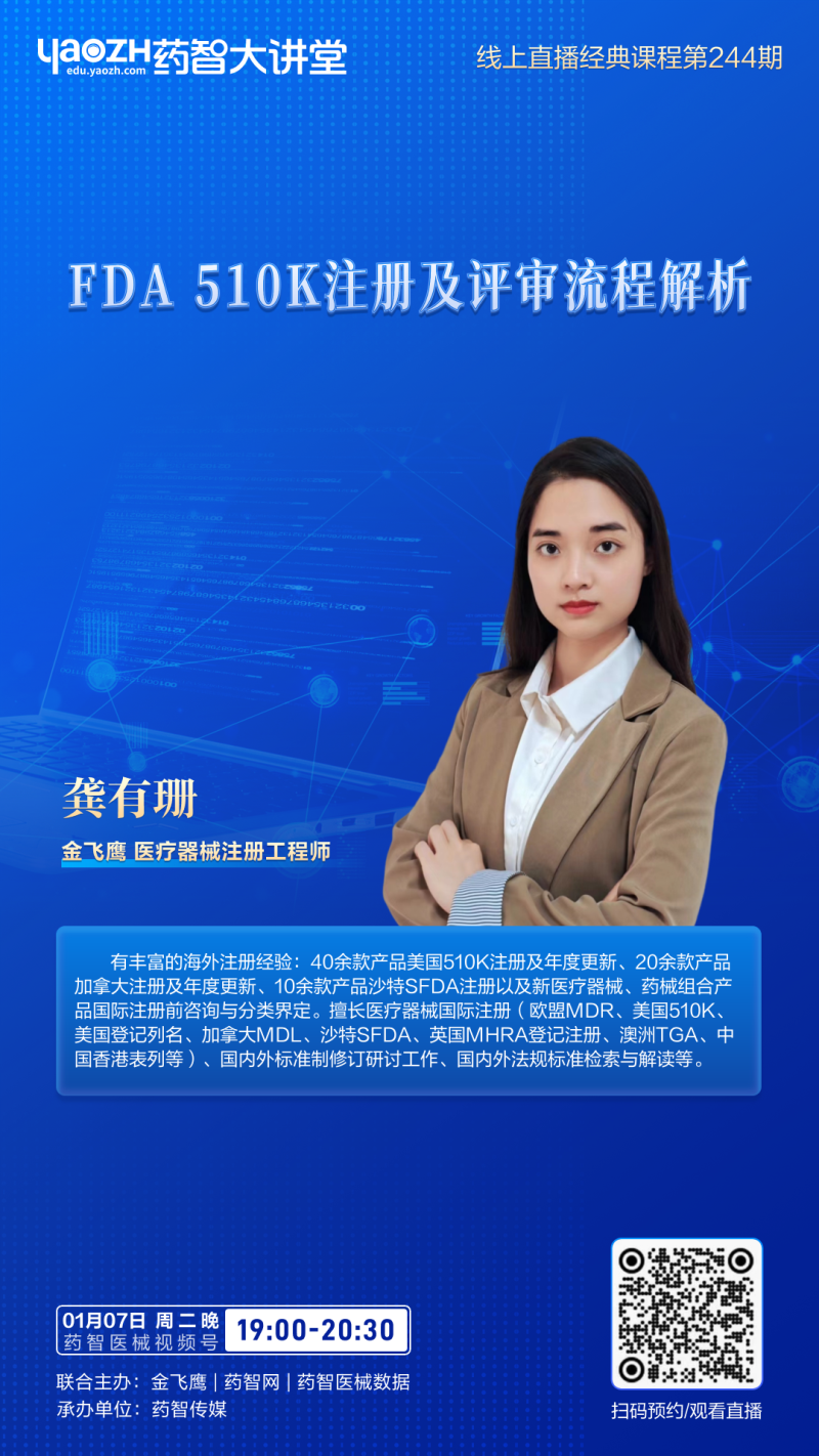 本期直播課程的主講人是金飛鷹資深國(guó)際注冊(cè)工程師龔老師,她將全面系統(tǒng)地講解醫(yī)療器械FDA 510(k)注冊(cè)的途徑、方法和注意事項(xiàng),同時(shí)結(jié)合她多年海外醫(yī)療器械注冊(cè)實(shí)戰(zhàn)經(jīng)驗(yàn),跟大家分享目前審評(píng)過程中的常見問題,并重點(diǎn)講解510(k)注冊(cè)的要求。感興趣的朋友記得識(shí)別下方二維碼提前預(yù)約~