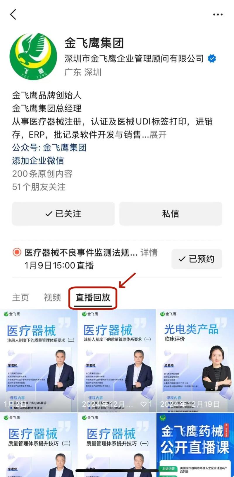 往期直播培訓課程支持回放,關注“金飛鷹藥械咨詢服務”視頻號并點擊視頻號主頁,即可查看“直播回放”哦~