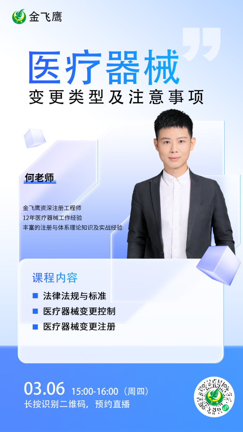 金飛鷹直播培訓(xùn),是每周一次的固定培訓(xùn)欄目,優(yōu)選金飛鷹國(guó)內(nèi)外資深注冊(cè)/項(xiàng)目老師定期為大家講解醫(yī)療器械注冊(cè)相關(guān)知識(shí),解答大家在醫(yī)療器械注冊(cè)過(guò)程中的諸多疑問(wèn)。