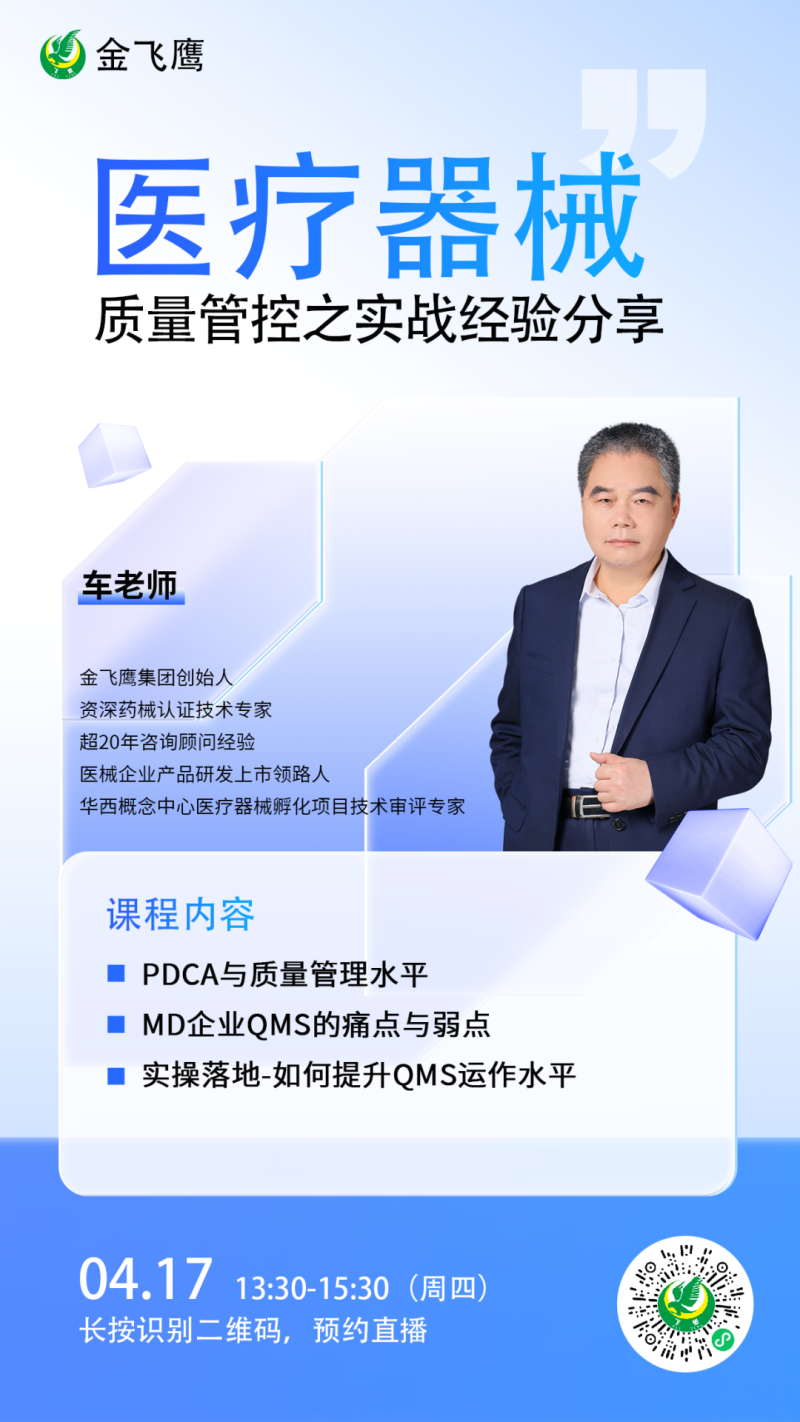 在此背景下,由金飛鷹、成都聯(lián)東U谷聯(lián)合主辦,成都高新區(qū)醫(yī)療器械創(chuàng)新轉(zhuǎn)化協(xié)會(huì)、動(dòng)脈網(wǎng)、成都數(shù)智醫(yī)療創(chuàng)新聯(lián)盟協(xié)會(huì)協(xié)辦的醫(yī)療器械質(zhì)量管理與注冊(cè)申報(bào)實(shí)操經(jīng)驗(yàn)分享的線下培訓(xùn),將于4月17日下午在成都溫江區(qū)聯(lián)東U谷·成都醫(yī)學(xué)城科技企業(yè)港30棟黨建活動(dòng)中心舉辦。本次培訓(xùn)聚焦“醫(yī)療器械質(zhì)量工作日常管理技巧實(shí)操經(jīng)驗(yàn)專題”和“醫(yī)療器械注冊(cè)申報(bào)技巧實(shí)操經(jīng)驗(yàn)專題”兩大熱門主題,由金飛鷹集團(tuán)創(chuàng)始人車號(hào)爽老師主導(dǎo)進(jìn)行分享,他將結(jié)合金飛鷹輔導(dǎo)過(guò)的眾多成功案例,深入剖析醫(yī)療器械質(zhì)量工作日常管理的實(shí)用技巧,為企業(yè)提供可落地的專業(yè)指導(dǎo),提升企業(yè)的市場(chǎng)競(jìng)爭(zhēng)力!
