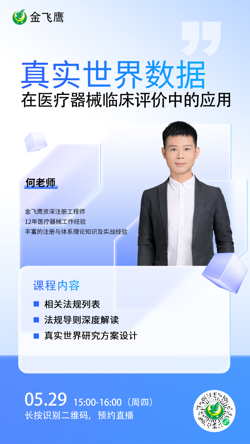 5月29日下午3點,金飛鷹資深注冊工程師、有著12年醫(yī)療器械行業(yè)從業(yè)經(jīng)驗的何老師給大家?guī)怼墩鎸嵤澜鐢?shù)據(jù)在醫(yī)療器械臨床評價中的應用》,他將立足法規(guī)要求,結合實戰(zhàn)案例,重點解析真實世界研究方案設計要點,為企業(yè)高效開展真實世界數(shù)據(jù)應用提供專業(yè)指導。