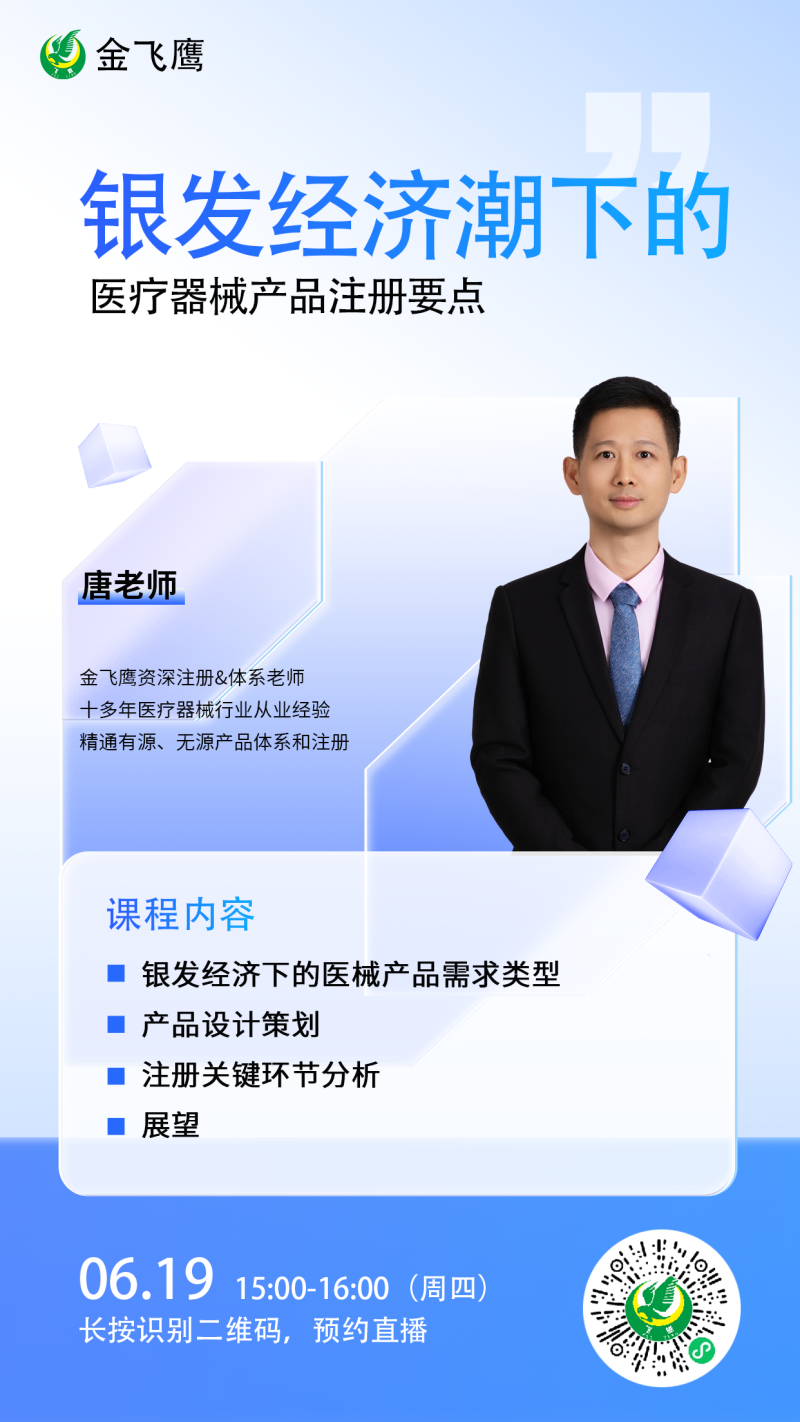 6月19日下午3點,有著十多年醫(yī)療器械行業(yè)從業(yè)經(jīng)驗、精通醫(yī)療器械產(chǎn)品注冊及體系輔導的唐老師給大家?guī)怼?/span>銀發(fā)經(jīng)濟浪潮下的醫(yī)療器械注冊要點》,感興趣的朋友記得提前預約,與我們一起解鎖“銀發(fā)經(jīng)濟”產(chǎn)品注冊全流程優(yōu)化方案~
