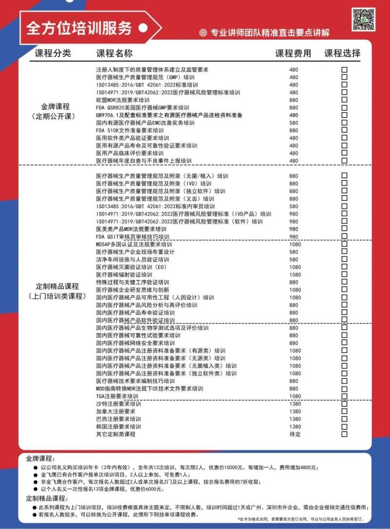 分為定期線下公開課及上門培訓(xùn)兩種形式,共有13節(jié)金牌課程+34節(jié)定制精品課程(詳見上方海報),課程主題涵蓋了醫(yī)療器械國內(nèi)外注冊及體系的多個環(huán)節(jié)、多個領(lǐng)域,優(yōu)選金飛鷹具備豐富專業(yè)知識及實戰(zhàn)經(jīng)驗的技術(shù)及項目老師,為學(xué)員提供全方位、高質(zhì)量的醫(yī)療器械注冊指導(dǎo)。