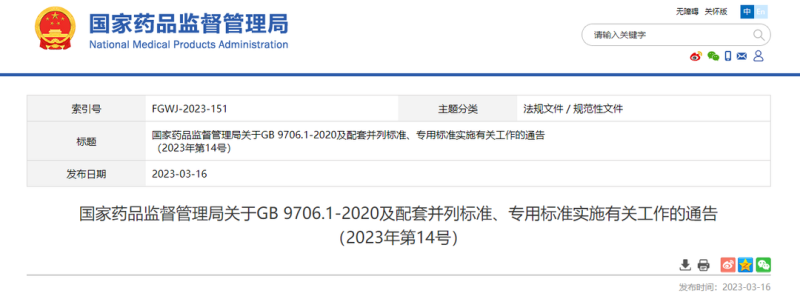 3月16日,國(guó)家藥監(jiān)局官網(wǎng)發(fā)布《關(guān)于GB 9706.1-2020及配套并列標(biāo)準(zhǔn)、專(zhuān)用標(biāo)準(zhǔn)實(shí)施有關(guān)工作的通告(2023年第14號(hào))》(以下簡(jiǎn)稱(chēng)《通告》),對(duì)注冊(cè)備案及檢驗(yàn)時(shí)【相關(guān)標(biāo)準(zhǔn)執(zhí)行要求】明確如下: