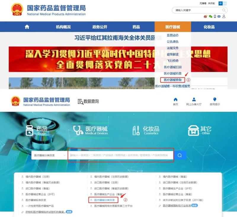 進(jìn)入國(guó)家藥監(jiān)局(https://www.nmpa.gov.cn/)網(wǎng)站,在首頁(yè)菜單中選擇“醫(yī)療器械”欄,并于下拉菜單中點(diǎn)擊“醫(yī)療器械查詢”,進(jìn)入頁(yè)面后點(diǎn)擊“醫(yī)療器械分類目錄”,即可按產(chǎn)品名稱、產(chǎn)品描述或預(yù)期用途等對(duì)產(chǎn)品類別進(jìn)行查詢。
