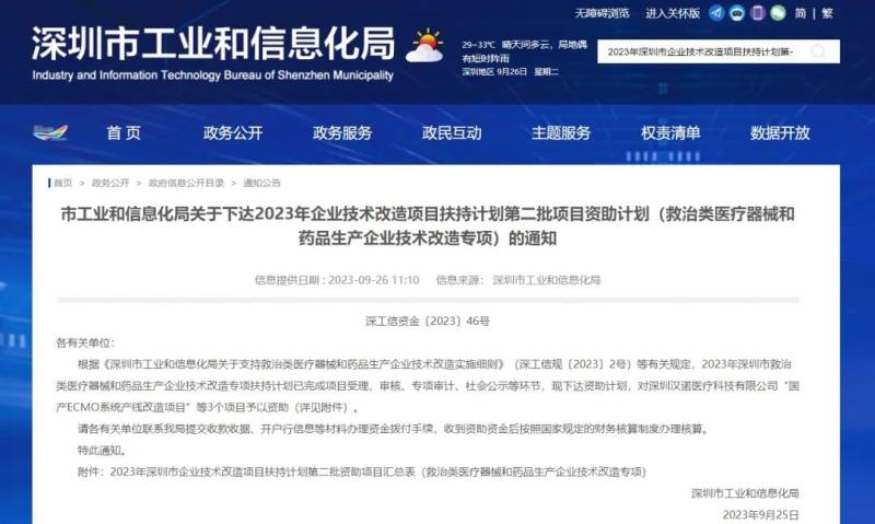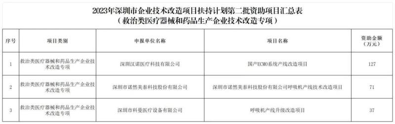 9月26日,深圳市工信局官網(wǎng)發(fā)布通知稱,2023年深圳市救治類醫(yī)療器械和藥品生產(chǎn)企業(yè)技術改造專項扶持計劃已完成項目受理、審核、專項審計、社會公示等環(huán)節(jié),現(xiàn)下達資助計劃,對深圳漢諾醫(yī)療科技有限公司“國產(chǎn)ECMO系統(tǒng)產(chǎn)線改造項目”、深圳市諾然美泰科技股份有限公司“呼吸機產(chǎn)線技術改造項目”等3個項目予以資助 [資助標準:對企業(yè)于2022年12月1日到2023年3月31日期間購買的相關生產(chǎn)設備(含配套軟件),按照不超過生產(chǎn)設備投資的30%予以專項資助] ,其中最高資助金額為127萬元,具體詳情如下: