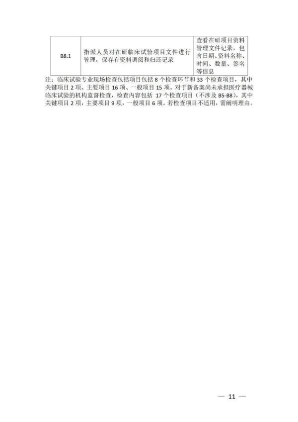 《檢查要點》指出,檢查內(nèi)容分為機構(gòu)和臨床試驗專業(yè)兩部分,包括17個檢查環(huán)節(jié)、78個檢查項目,包括對條件與備案管理、運行情況等方面的現(xiàn)場檢查內(nèi)容。檢查項目中關(guān)鍵項目共計8項(標示為“★★”),主要項目共計34項(標示為“★”),一般項目共計36項。其中8項關(guān)鍵項目具體如下: