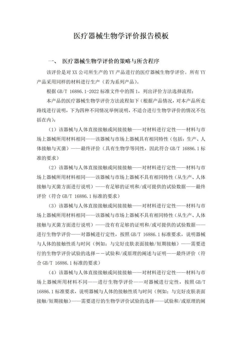 撰寫生物學(xué)評價報告時,可從醫(yī)療器械生物學(xué)評價的策略與所含程序、醫(yī)療器械所用材料的描述、材料表征、選擇或放棄生物學(xué)試驗的理由與論證、已有數(shù)據(jù)與試驗結(jié)果的匯總、完成生物學(xué)評價所需的其他數(shù)據(jù)、總結(jié)七個方面分別進行闡述,我們將報告模板部分內(nèi)容展示如下:
