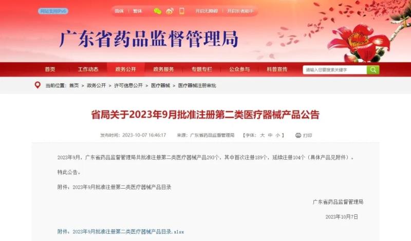 近日,廣東省藥監(jiān)局官網(wǎng)發(fā)布2023年9月批準(zhǔn)注冊(cè)第二類醫(yī)療器械產(chǎn)品的公告,該公告顯示,2023年9月,廣東省藥品監(jiān)督管理局共批準(zhǔn)注冊(cè)第二類醫(yī)療器械產(chǎn)品293個(gè),其中首次注冊(cè)189個(gè),延續(xù)注冊(cè)104個(gè)。
