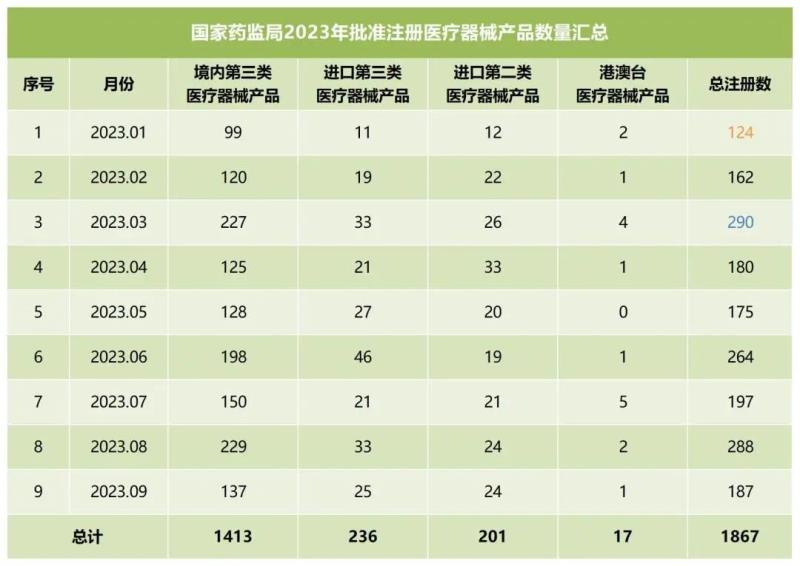 我們同步匯總了2023年各個(gè)月份國(guó)家藥監(jiān)局批準(zhǔn)注冊(cè)的醫(yī)療器械產(chǎn)品數(shù)量(見(jiàn)下方表格),從表格中可以看出,截至9月,2023年國(guó)家藥監(jiān)局總計(jì)批準(zhǔn)注冊(cè)醫(yī)療器械產(chǎn)品1867個(gè),其中境內(nèi)第三類醫(yī)療器械產(chǎn)品1413個(gè),進(jìn)口第三類醫(yī)療器械產(chǎn)品236個(gè)(第三類醫(yī)療器械產(chǎn)品總計(jì)1649個(gè)),進(jìn)口第二類醫(yī)療器械產(chǎn)品201個(gè),港澳臺(tái)醫(yī)療器械產(chǎn)品17個(gè)。