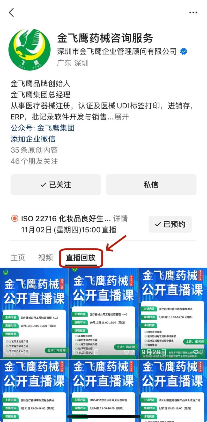 往期直播培訓課程支持回放,關(guān)注“金飛鷹藥械咨詢服務(wù)”視頻號并點擊視頻號主頁,即可查看“直播回放”哦~