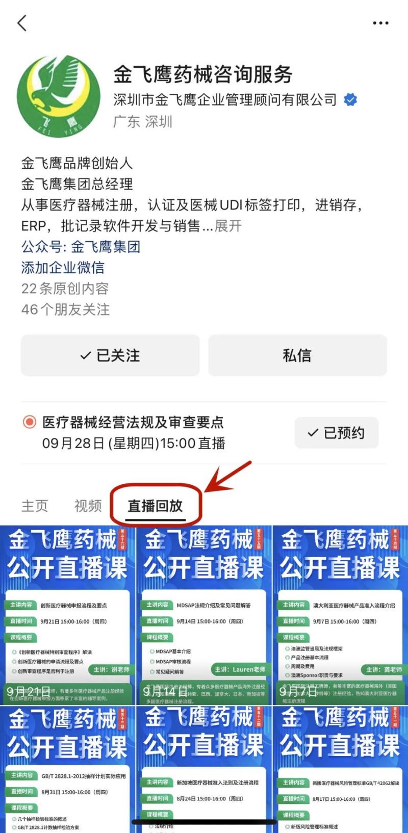 往期直播培訓(xùn)課程支持回放,關(guān)注“金飛鷹藥械咨詢服務(wù)”視頻號并點(diǎn)擊視頻號主頁,即可查看“直播回放”哦~