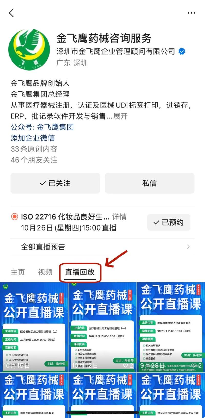 往期直播培訓(xùn)課程支持回放,關(guān)注“金飛鷹藥械咨詢服務(wù)”視頻號并點擊視頻號主頁,即可查看“直播回放”哦~