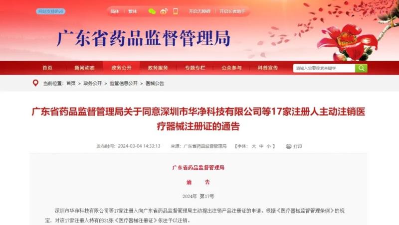 3月4日,廣東藥監(jiān)局發(fā)布通告稱,深圳市華凈科技有限公司等17家注冊人向廣東省藥品監(jiān)督管理局主動提出注銷產品注冊證的申請,注銷產品以醫(yī)用口罩居多,還有紅外體溫計、額溫計、電子血壓計等。根據《醫(yī)療器械監(jiān)督管理條例》的規(guī)定,該局對該17家注冊人持有的31張《醫(yī)療器械注冊證》依法予以注銷。具體注銷清單如下: