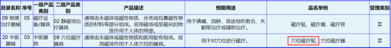 穴位磁療貼屬于磁療產(chǎn)品這個大類,它是指利用磁場的物理性能治療或緩解人體疾病的醫(yī)療器械。雖然磁療也是物理治療方式的一種,但因為本期取證產(chǎn)品名稱有一個前綴“穴位”,便被劃分到了“中醫(yī)器械”范疇,分類編碼20-03-09(未被應(yīng)用在穴位的磁療貼分類編碼則為09-05-02)。