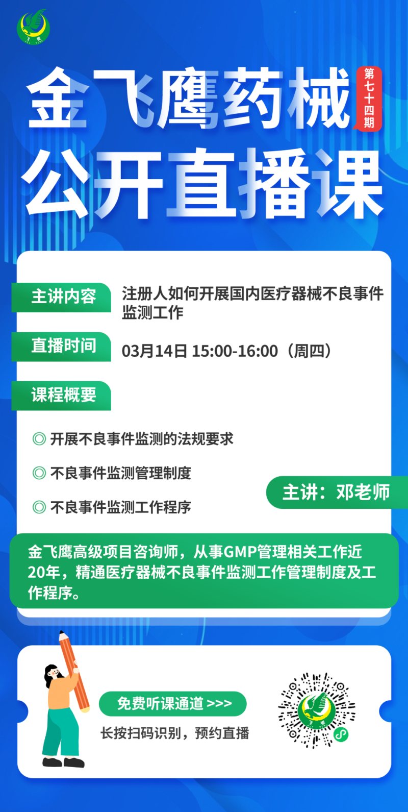 3月14日下午3點,金飛鷹高級項目咨詢師,從事GMP管理相關工作近20年,精通醫(yī)療器械不良事件監(jiān)測工作管理制度及工作程序的鄧老師,給大家?guī)怼蹲匀巳绾伍_展國內醫(yī)療器械不良事件監(jiān)測工作》,培訓內容包括醫(yī)療器械不良事件監(jiān)測管理制度、工作程序等,感興趣的企業(yè)千萬不要錯過了哦!