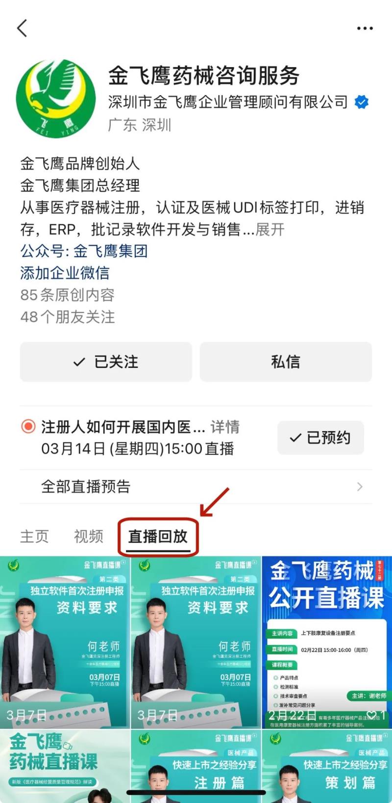 劃重點!往期直播培訓課程支持回放,關注“金飛鷹藥械咨詢服務”視頻號并點擊視頻號主頁,即可查看“直播回放”哦~