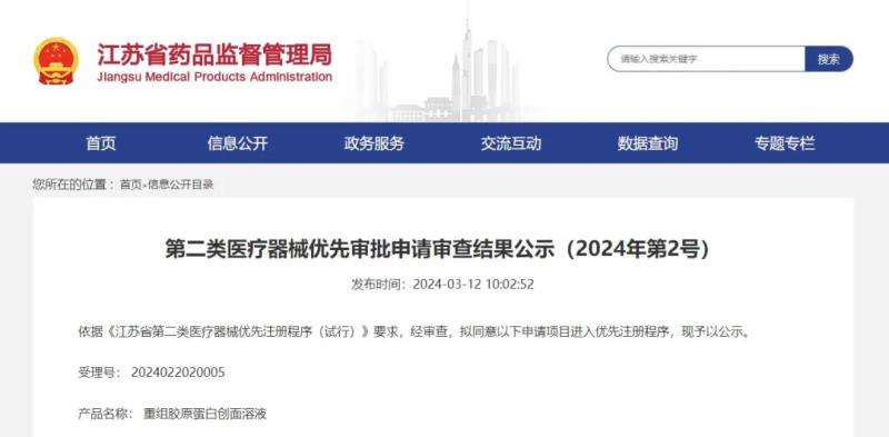 3月12日,江蘇省藥監(jiān)局公示了一期第二類醫(yī)療器械優(yōu)先審批申請審查結(jié)果,公示內(nèi)容顯示,這是兩款重組膠原蛋白產(chǎn)品(重組膠原蛋白創(chuàng)面溶液&重組膠原蛋白凍干纖維),申請人均為南京天縱易康生物科技股份有限公司,優(yōu)先審批理由如下:該產(chǎn)品符合《江蘇省第二類醫(yī)療器械優(yōu)先注冊程序(試行)》第四條中第(三)項(xiàng)規(guī)定的要求,即“列入國家或省部級科技重大專項(xiàng)、省部級重點(diǎn)研發(fā)計劃的醫(yī)療器械”,適用優(yōu)先注冊程序。