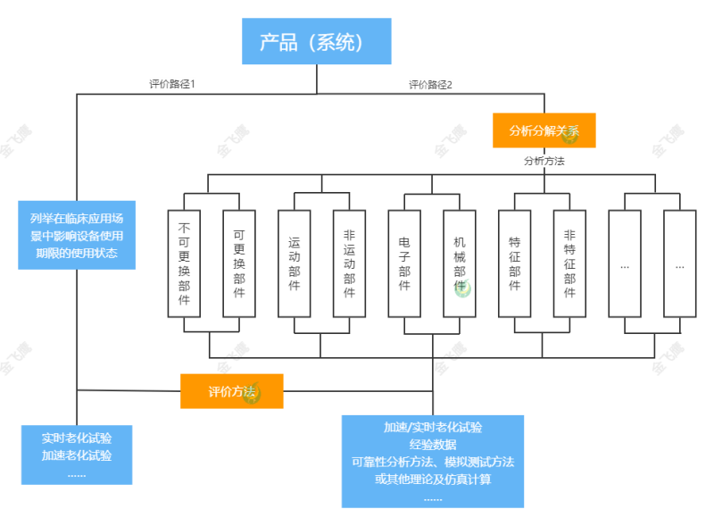 2)通過將產(chǎn)品(系統(tǒng))分解為不同子系統(tǒng)/部件的方式進行評價。首先應詳細分析分解關系,在此基礎上通過不同的分解方式(如將產(chǎn)品分為關鍵部件及非關鍵部件和/或特征部件及非特征部件和/或可更換部件及不可更換部件和/或運動部件及非運動部件和/或電子部件及機械部件等)確定產(chǎn)品的使用期限。