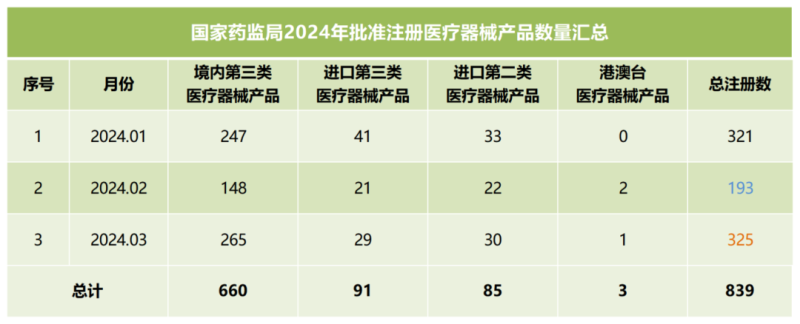 我們同步匯總了2024年第一季度國(guó)家藥監(jiān)局批準(zhǔn)注冊(cè)的醫(yī)療器械產(chǎn)品數(shù)量(見下方表格),從表格中可以看出,截至3月,2024年國(guó)家藥監(jiān)局總計(jì)批準(zhǔn)注冊(cè)醫(yī)療器械產(chǎn)品839個(gè),其中境內(nèi)第三類醫(yī)療器械產(chǎn)品660個(gè),進(jìn)口第三類醫(yī)療器械產(chǎn)品91個(gè),進(jìn)口第二類醫(yī)療器械產(chǎn)品85個(gè),港澳臺(tái)醫(yī)療器械產(chǎn)品3個(gè)。