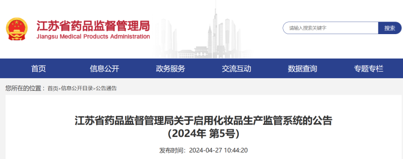 近日,江蘇省藥品監(jiān)督管理局發(fā)布通告,自2024年5月1日起,全省化妝品生產(chǎn)監(jiān)管系統(tǒng)將正式投入使用。相關(guān)事宜公告如下:
