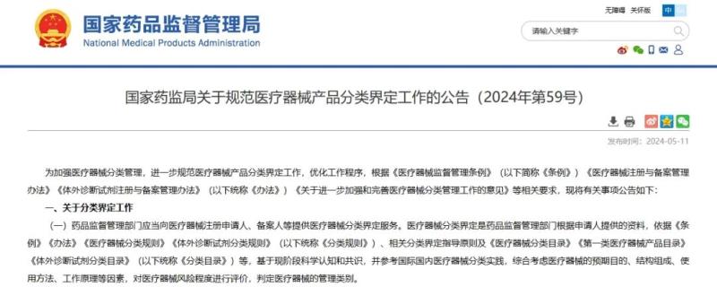 5月11日,國家藥監(jiān)局發(fā)布《關于規(guī)范醫(yī)療器械產(chǎn)品分類界定工作的公告(2024年第59號)》,具體內(nèi)容如下: