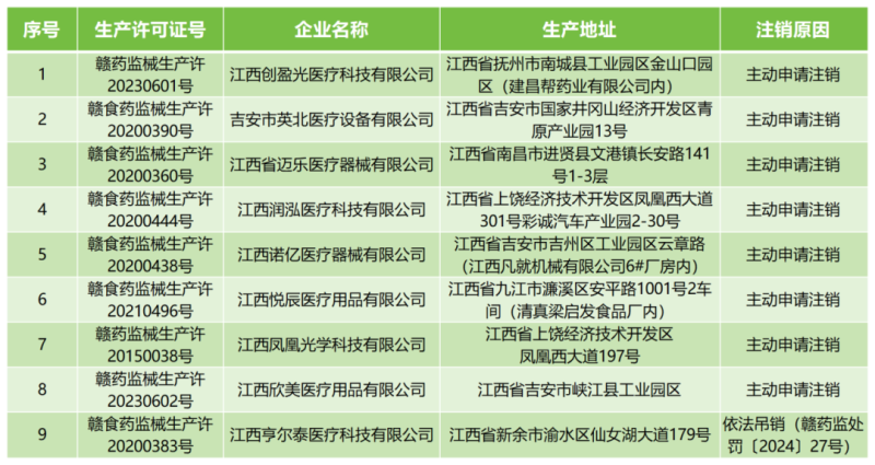 5月15日,江西省藥監(jiān)局官網(wǎng)發(fā)布一則醫(yī)療器械生產(chǎn)許可證注銷公告,公告顯示,該局已依法注銷江西創(chuàng)盈光醫(yī)療科技有限公司、江西省邁樂醫(yī)療器械有限公司等9家企業(yè)的醫(yī)療器械生產(chǎn)許可證,其中8家為主動申請注銷,1家為依法吊銷,具體明細如下: