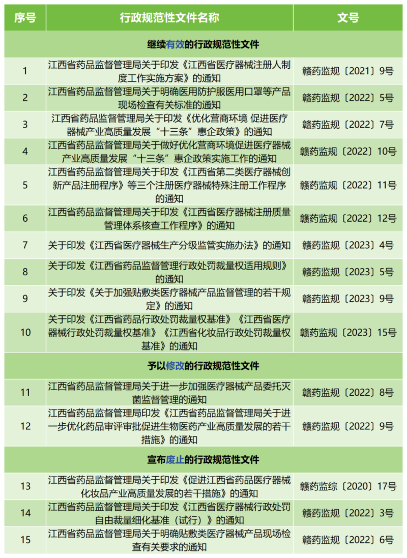 近日,江西省藥監(jiān)局發(fā)布公告稱(chēng),該局已對(duì)2023年12月31日前發(fā)布的規(guī)范性文件進(jìn)行清理。經(jīng)清理,31件繼續(xù)有效,4件予以修改,12件宣布廢止。我們將其中涉及到醫(yī)療器械的相關(guān)文件匯總?cè)缦拢?/span>