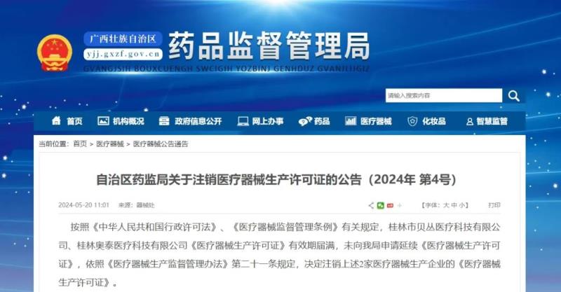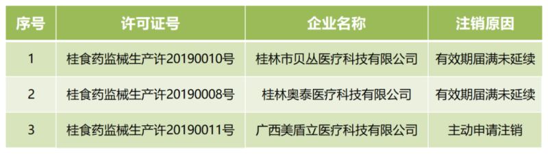 近日,廣西壯族自治區(qū)藥監(jiān)局發(fā)布公告稱,因有效期屆滿未延續(xù)等原因,該局已依法注銷桂林市貝叢醫(yī)療科技有限公司、桂林奧泰醫(yī)療科技有限公司等3家企業(yè)的《醫(yī)療器械生產(chǎn)許可證》,具體明細(xì)如下: