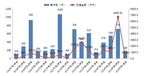 2024年第1季度共查處醫(yī)療器械案件184件,貨值金額279.99萬元,罰款金額461.38萬元,沒收違法所得金額25.73萬元,移送司法機(jī)關(guān)案件數(shù)1件,行政處罰案件信息公開數(shù)167件。