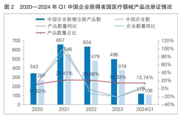 2024年一季度,美國醫(yī)療器械新增產(chǎn)品注冊數(shù)量達866件,同比增長21.12%(詳見圖1),共涉及735家企業(yè)(醫(yī)療器械制造商)。其中,中國(含香港、澳門及臺灣地區(qū))有108家企業(yè)在美獲得119件醫(yī)療器械產(chǎn)品注冊證,占美國醫(yī)療器械產(chǎn)品新注冊總數(shù)的13.74%,產(chǎn)品數(shù)量同比增長1.7%(詳見圖2)。
