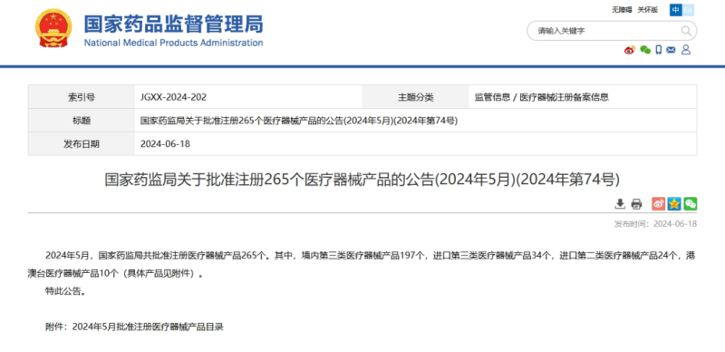 6月18日,國家藥監(jiān)局官網(wǎng)發(fā)布公告稱,2024年5月,國家藥監(jiān)局共批準(zhǔn)注冊醫(yī)療器械產(chǎn)品265個(gè)。其中,境內(nèi)第三類醫(yī)療器械產(chǎn)品197個(gè),進(jìn)口第三類醫(yī)療器械產(chǎn)品34個(gè),進(jìn)口第二類醫(yī)療器械產(chǎn)品24個(gè),港澳臺醫(yī)療器械產(chǎn)品10個(gè)。