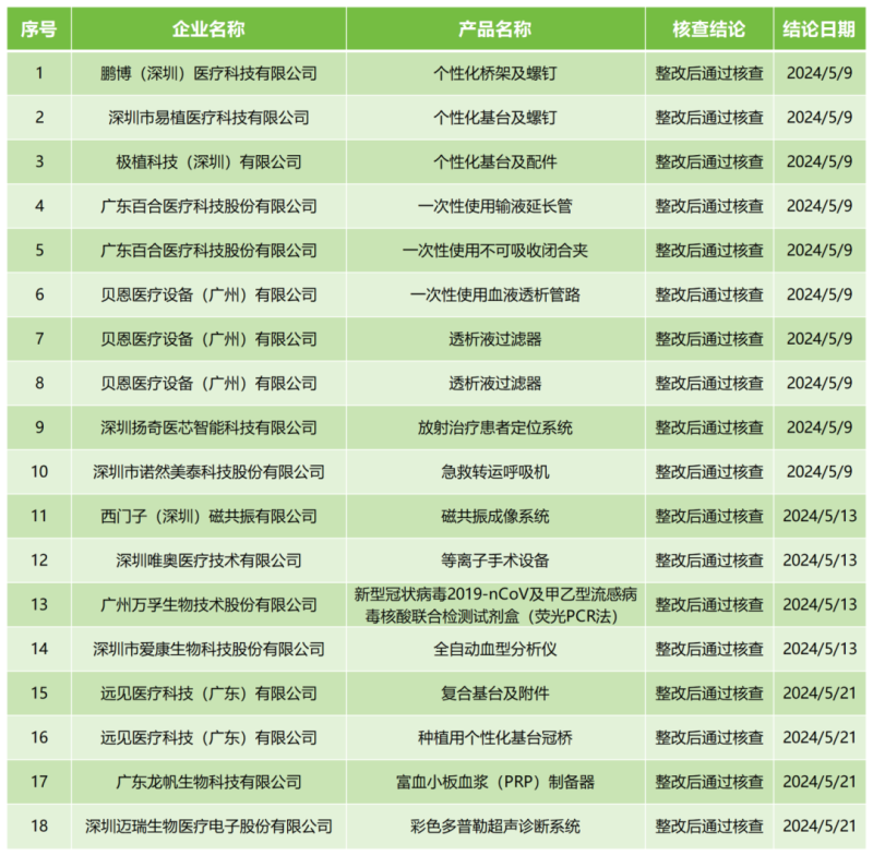 6月25日,廣東省藥監(jiān)局官網公布2024年5月醫(yī)療器械注冊質量管理體系核查結果,包括西門子(深圳)磁共振有限公司的磁共振成像系統(tǒng)、深圳唯奧醫(yī)療技術有限公司的等離子手術設備、深圳邁瑞生物醫(yī)療電子股份有限公司的彩色多普勒超聲診斷系統(tǒng)等共計18款產品,均為“整改后通過核查”。具體明細見下方表格: