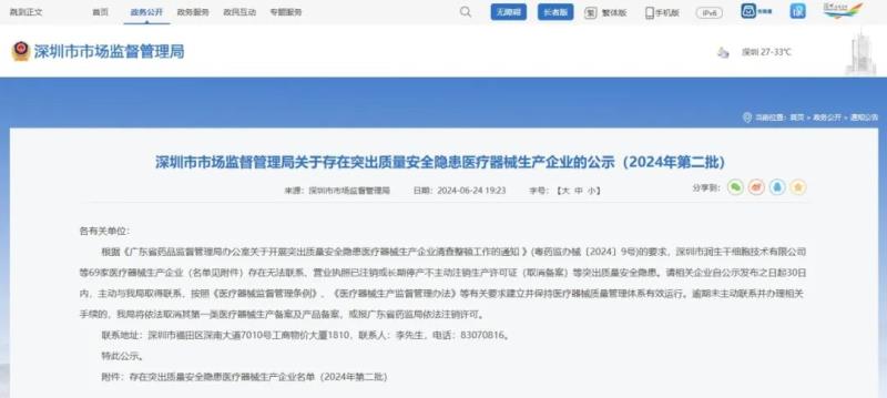 近日,深圳市市場監(jiān)督管理局發(fā)布《關(guān)于存在突出質(zhì)量安全隱患醫(yī)療器械生產(chǎn)企業(yè)的公示(2024年第二批)》,其中指出,深圳市潤生干細胞技術(shù)有限公司、深圳醫(yī)龍科技有限公司等69家醫(yī)療器械生產(chǎn)企業(yè)存在無法聯(lián)系、營業(yè)執(zhí)照已注銷或長期停產(chǎn)不主動注銷生產(chǎn)許可證(取消備案)等突出質(zhì)量安全隱患。