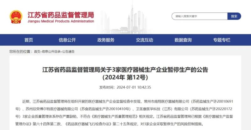 江蘇省藥品監(jiān)督管理局已根據(jù)《醫(yī)療器械生產(chǎn)監(jiān)督管理辦法》第六十四條第二款、《藥品醫(yī)療器械飛行檢查辦法》第二十五條規(guī)定,對(duì)3家企業(yè)采取暫停生產(chǎn)的風(fēng)險(xiǎn)控制措施。