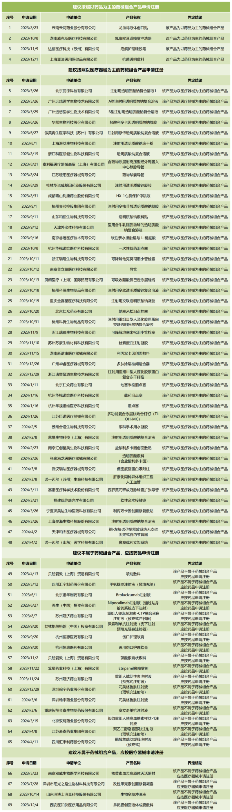 近日,國(guó)家藥監(jiān)局醫(yī)療器械標(biāo)準(zhǔn)管理中心發(fā)布《2023-2024年度藥械組合產(chǎn)品屬性界定結(jié)果匯總》,匯總公開(kāi)了2023年6月1日至2024年5月31日期間的藥械組合產(chǎn)品屬性界定結(jié)果,具體如下: