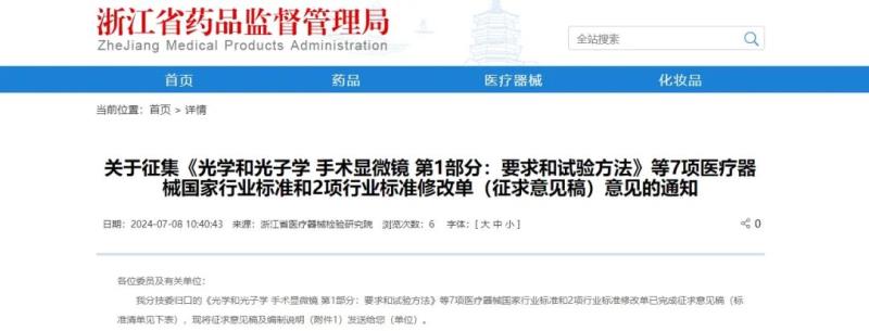 7月8日,浙江省藥監(jiān)局轉(zhuǎn)載了浙江省醫(yī)療器械檢驗研究院有關(guān)征集《光學(xué)和光子學(xué) 手術(shù)顯微鏡 第1部分:要求和試驗方法》《強脈沖光治療設(shè)備》等7項醫(yī)療器械國家/行業(yè)標(biāo)準(zhǔn)和2項行業(yè)標(biāo)準(zhǔn)修改單意見的通知,具體標(biāo)準(zhǔn)清單如下: