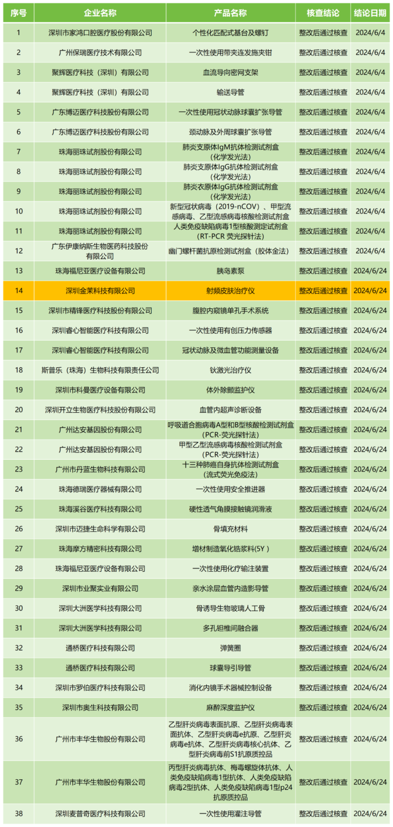 7月16日,廣東省藥監(jiān)局官網(wǎng)公布2024年6月醫(yī)療器械注冊質量管理體系核查結果,包括深圳市家鴻口腔醫(yī)療股份有限公司的個性化匹配式基臺及螺釘、珠海福尼亞醫(yī)療設備有限公司的胰島素泵、深圳金茉科技有限公司的射頻皮膚治療儀等共計38款產(chǎn)品,均為“整改后通過核查”。具體明細見下方表格: