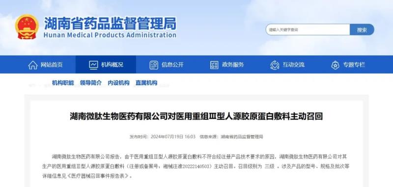 近日,湖南省藥監(jiān)局發(fā)布公告稱,據(jù)湖南微肽生物醫(yī)藥有限公司報(bào)告,由于醫(yī)用重組Ⅲ型人源膠原蛋白敷料不符合經(jīng)注冊產(chǎn)品技術(shù)要求(具體情況:經(jīng)廣東省醫(yī)療器械抽檢,該批號產(chǎn)品裝量標(biāo)示規(guī)格3ml,實(shí)際檢測結(jié)果3.5ml),湖南微肽生物醫(yī)藥有限公司對其生產(chǎn)的醫(yī)用重組Ⅲ型人源膠原蛋白敷料(注冊證編號:湘械注準(zhǔn)20222140503)主動(dòng)召回。召回級別為三級。