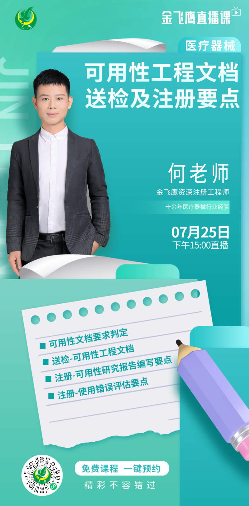 7月25日下午3點(diǎn),金飛鷹資深注冊(cè)工程師,擁有十余年醫(yī)療器械行業(yè)經(jīng)驗(yàn),對(duì)可用性工程頗有研究的何老師,繼續(xù)給大家?guī)怼夺t(yī)療器械可用性工程文檔送檢及注冊(cè)要點(diǎn)》,培訓(xùn)內(nèi)容包括可用性文檔要求判定、送檢環(huán)節(jié)的可用性工程文檔要求、注冊(cè)環(huán)節(jié)的可用性研究報(bào)告編寫要點(diǎn)及使用錯(cuò)誤評(píng)估要點(diǎn),大家千萬不要錯(cuò)過了哦!