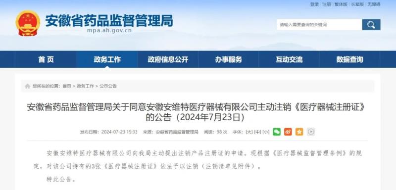 7月23日,安徽省藥監(jiān)局發(fā)布公告稱,安徽安維特醫(yī)療器械有限公司向該局主動(dòng)提出注銷產(chǎn)品注冊(cè)證的申請(qǐng)。根據(jù)《醫(yī)療器械監(jiān)督管理?xiàng)l例》的規(guī)定,安徽省藥監(jiān)局對(duì)這家公司持有的3張《醫(yī)療器械注冊(cè)證》依法予以注銷,注銷清單具體如下: