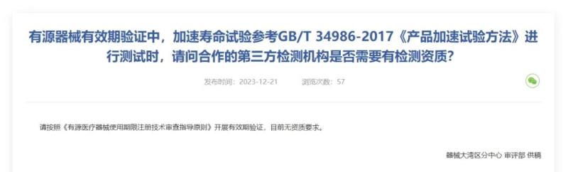 根據(jù)國家藥監(jiān)局醫(yī)療器械技術審評檢查大灣區(qū)分中心的答復,加速老化試驗目前無資質(zhì)要求,按照《有源醫(yī)療器械使用期限注冊技術審查指導原則》開展有效期驗證即可。