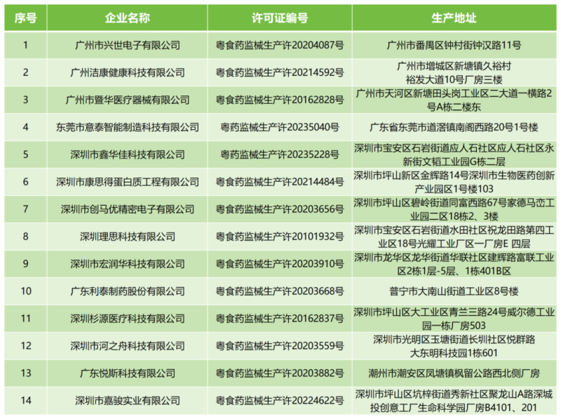 近日,廣東藥監(jiān)局發(fā)布通告稱(chēng),根據(jù)企業(yè)申請(qǐng),該局依法注銷(xiāo)了廣州市興世電子有限公司、廣州潔康健康科技有限公司、深圳理思科技有限公司等14家企業(yè)的《醫(yī)療器械生產(chǎn)許可證》。具體清單如下: