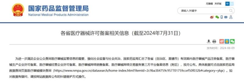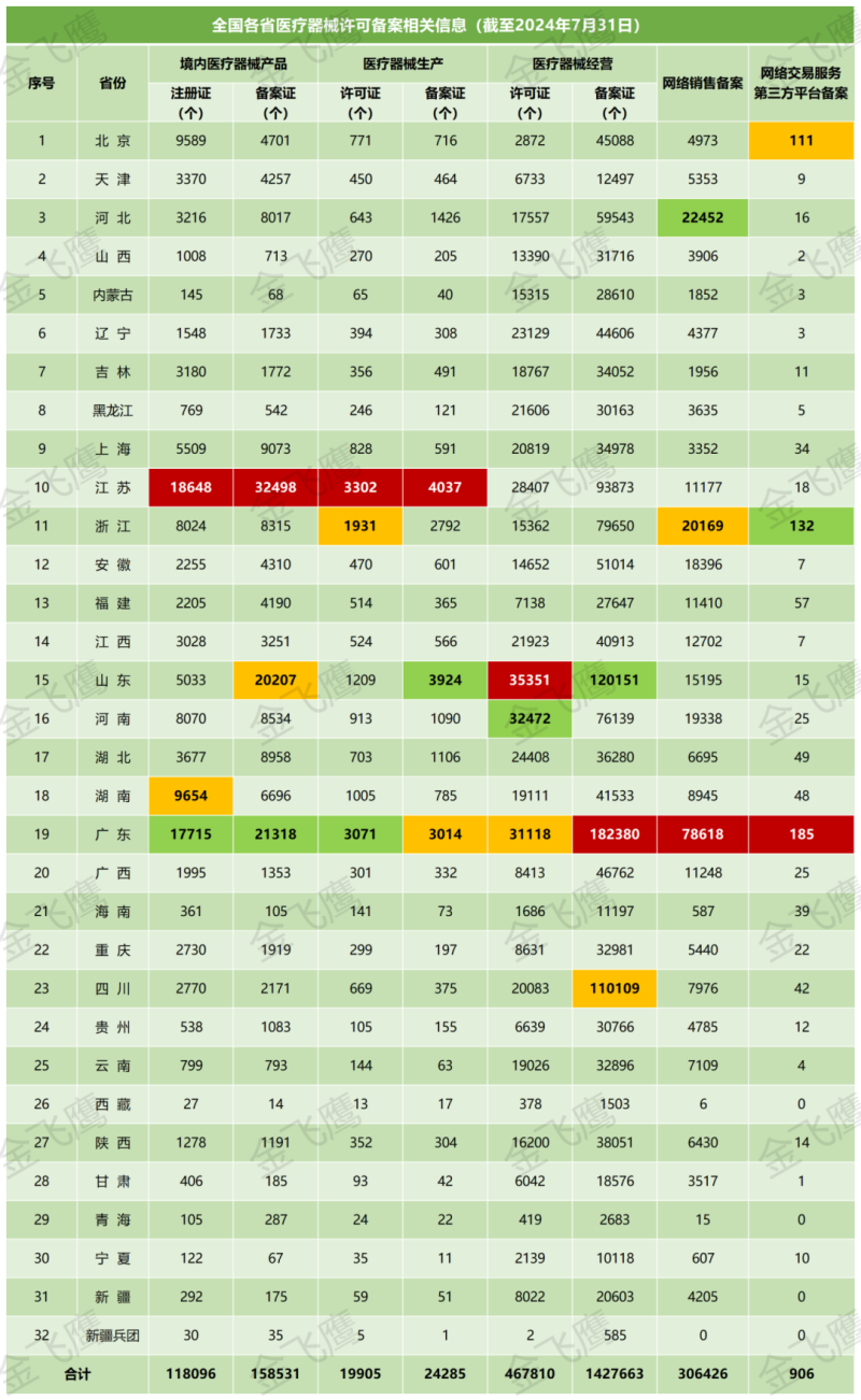 近日,國家藥監(jiān)局公布了截至2024年7月31日各省有效期內(nèi)醫(yī)療器械產(chǎn)品注冊備案、醫(yī)療器械生產(chǎn)企業(yè)許可備案等信息,老規(guī)矩,金飛鷹小編對此稍作編輯,標注紅色、綠色、黃色的分別為前三甲。